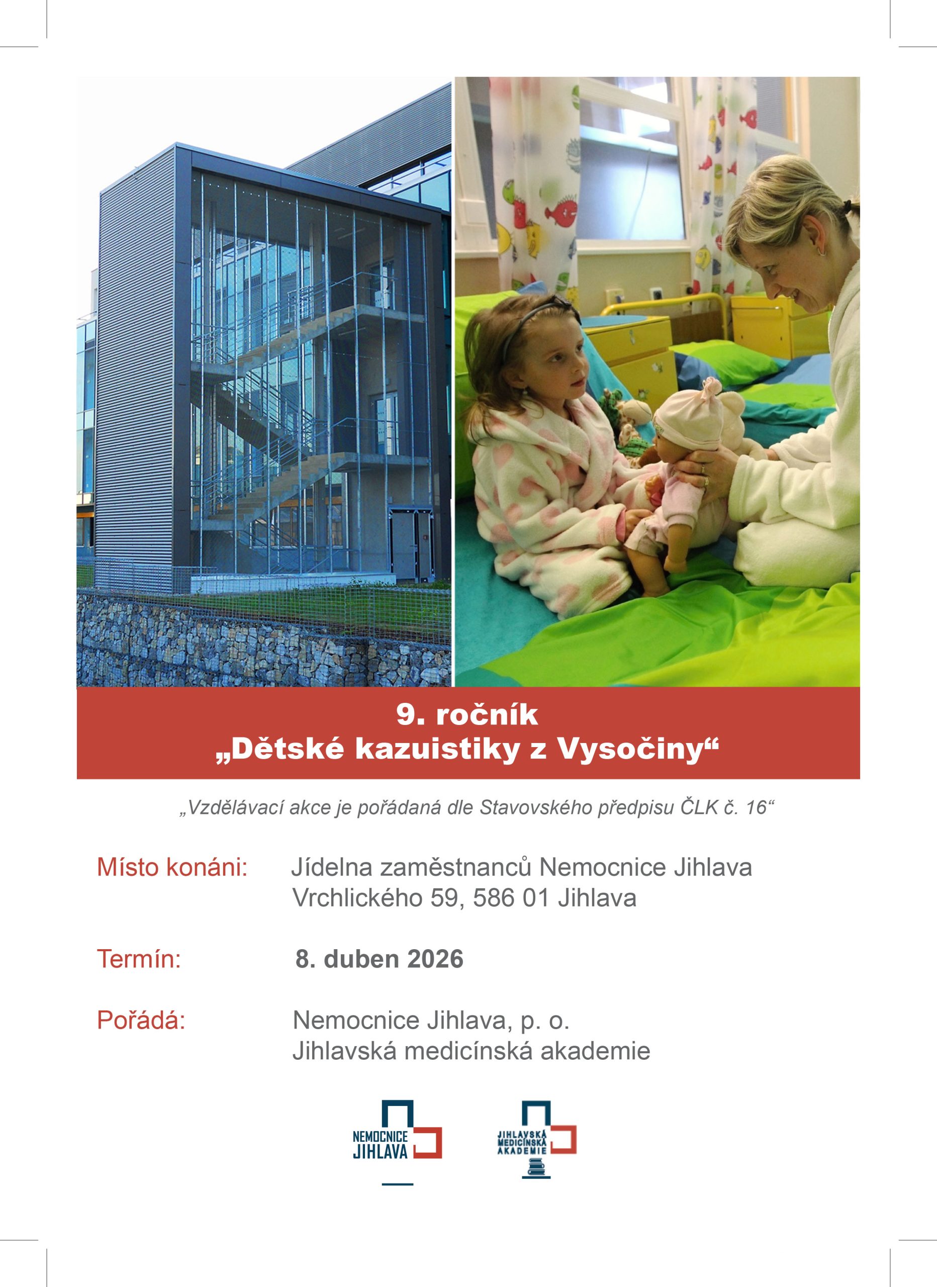 rádi bychom Vás pozvali na konferenci, 9. ročník: Dětské kazuistiky z Vysočiny. Konference se koná 8.4.2026 od 14:30hod. v jídelně zaměstnanců Nemocnice Jihlava.