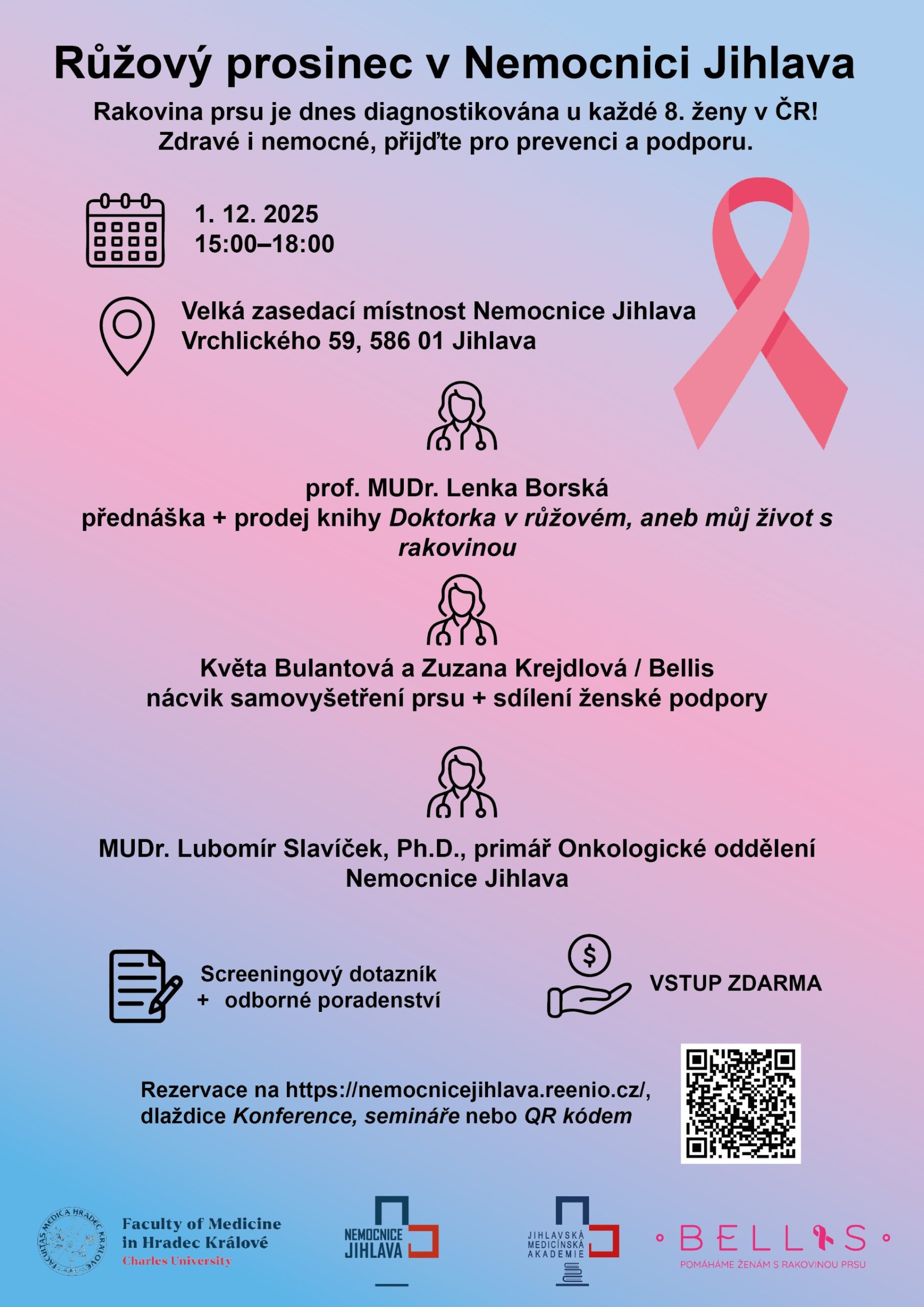 Nemocnice Jihlava zve veřejnost na akci Růžový prosinec, která se uskuteční 1. prosince od 15 hodin. Akce je zaměřena na prevenci rakoviny prsu – onemocnění, které je v České republice diagnostikováno u každé osmé ženy. Cílem setkání je poskytnout informace o včasné prevenci, nabídnout odborné rady a sdílet osobní zkušenosti žen, které s touto nemocí bojují. Vstup na akci je zdarma.